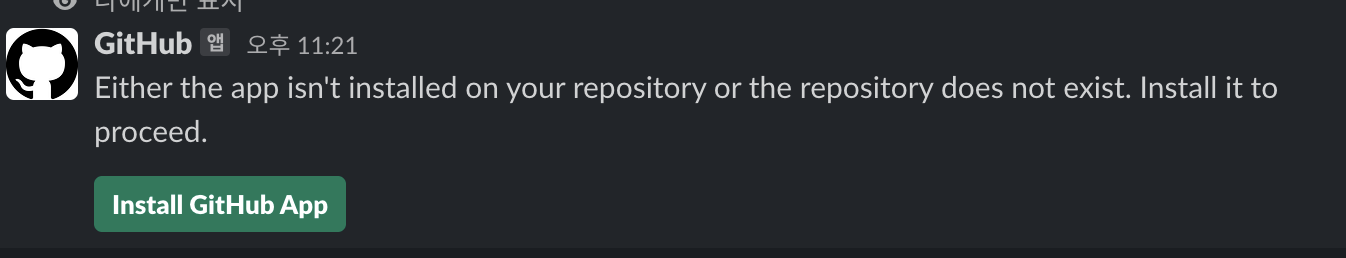 Github app이 설치되어 있지 않다면 설치를 해야합니다. 왼쪽 상단 더보기를 눌러 앱을 선택해줍니다. 아마 개발자 슬랙방이라면 이미 설치되어 있을 가능성이 높습니다. 설치되어있다면 다음 레포지토리 연동 부분부터 보시면 됩니다.